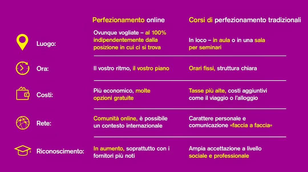 Il perfezionamento online offre flessibilità, è spesso più economico ed è perfetto per chi ha un’agenda piena.